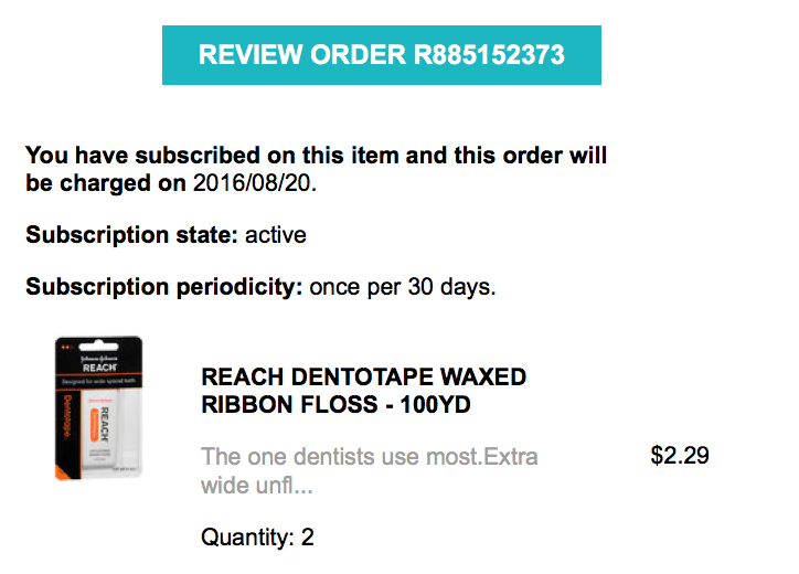 2. The default order is always a one time order. So you will not be getting a subscription order unless you chose subscription at the time of your first order. Your initial order confirmation also shows that your order is in subscription status. Starting in July 2016, we have included additional information on the order confirmation email which shows the next ship date as below: