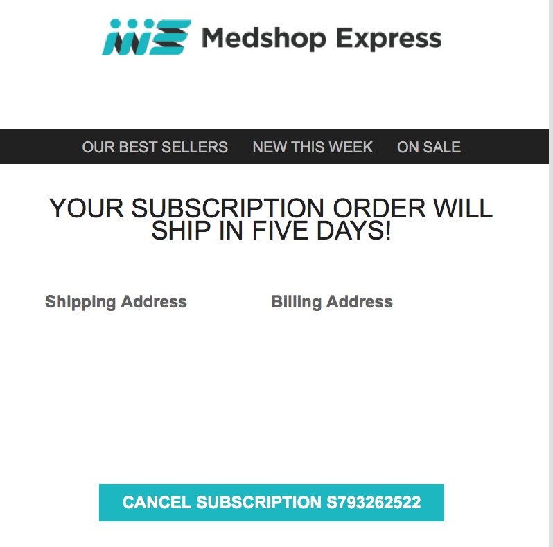 3. Since we can't cancel the order once the subscription ships, our our system automatically sends you an email 5 days prior to shipment to notify you that you are in a subscription plan. At this time, you have an opportunity to adjust the subscription delivery or cancel. This notification email looks like below: